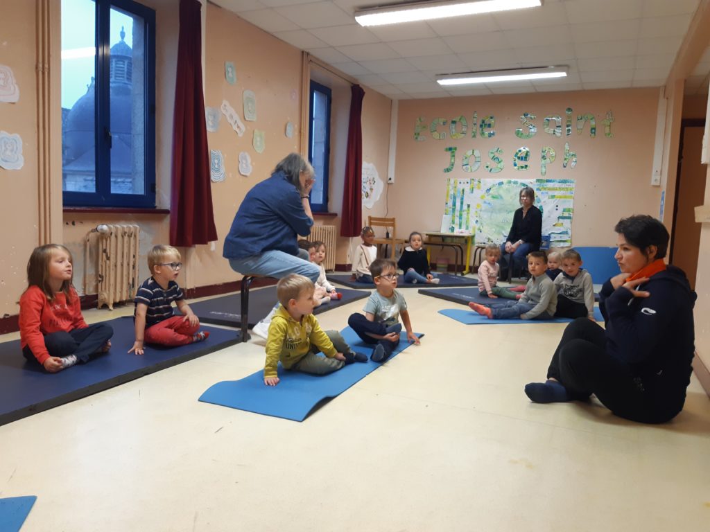 Emmanuelle de l’UGSEL 29 vient nous faire profiter de séances de bien-être où nous apprenons à connaître notre corps, à respirer, à nous détendre. Des petits exercices sont proposés afin d’être réutilisés à la maison, en classe: les volets, le tableau magique (massages avec les doigts, des voitures), l’oiseau, le bûcheron, le papillon, l’arbre dans le vent….Ces exercices sont aussi travaillés en dehors des séances, nous commençons ainsi à travailler le vocabulaire des émotions, pour savoir à quels moments, ces exercices sont bénéfiques.